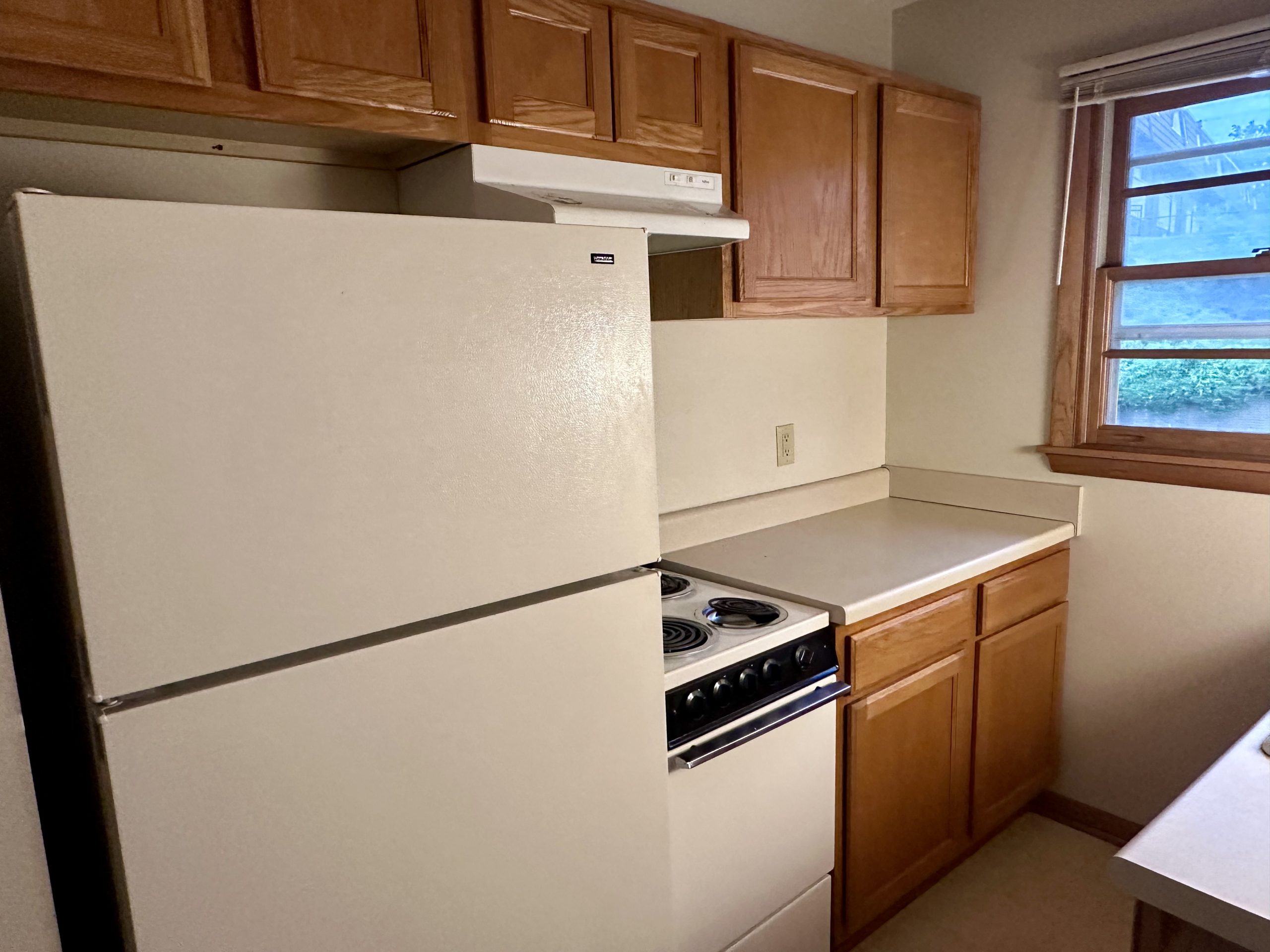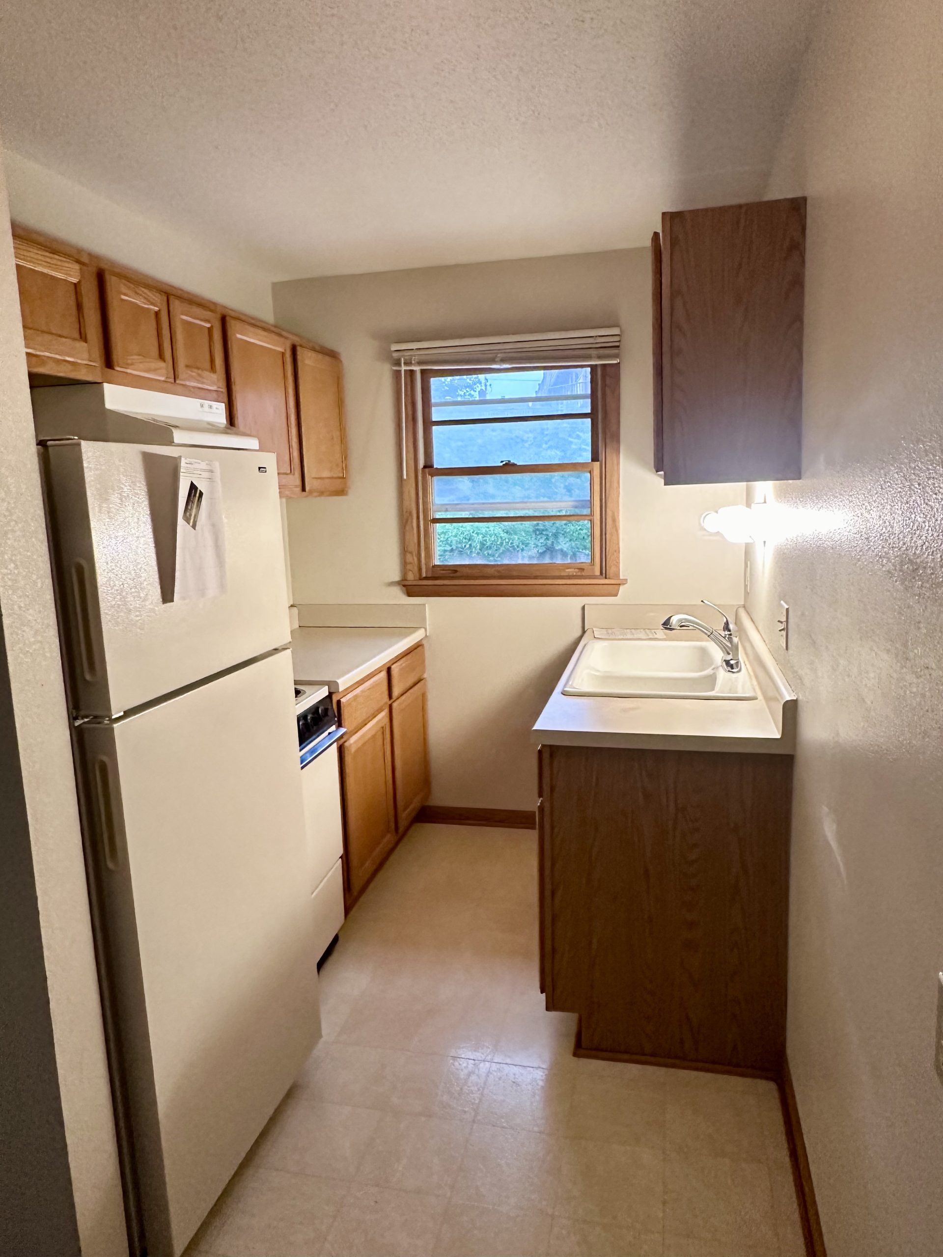 • Kitchen: Functional galley kitchen featuring full-size refrigerator and stove, plus plenty of cabinet space.